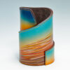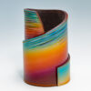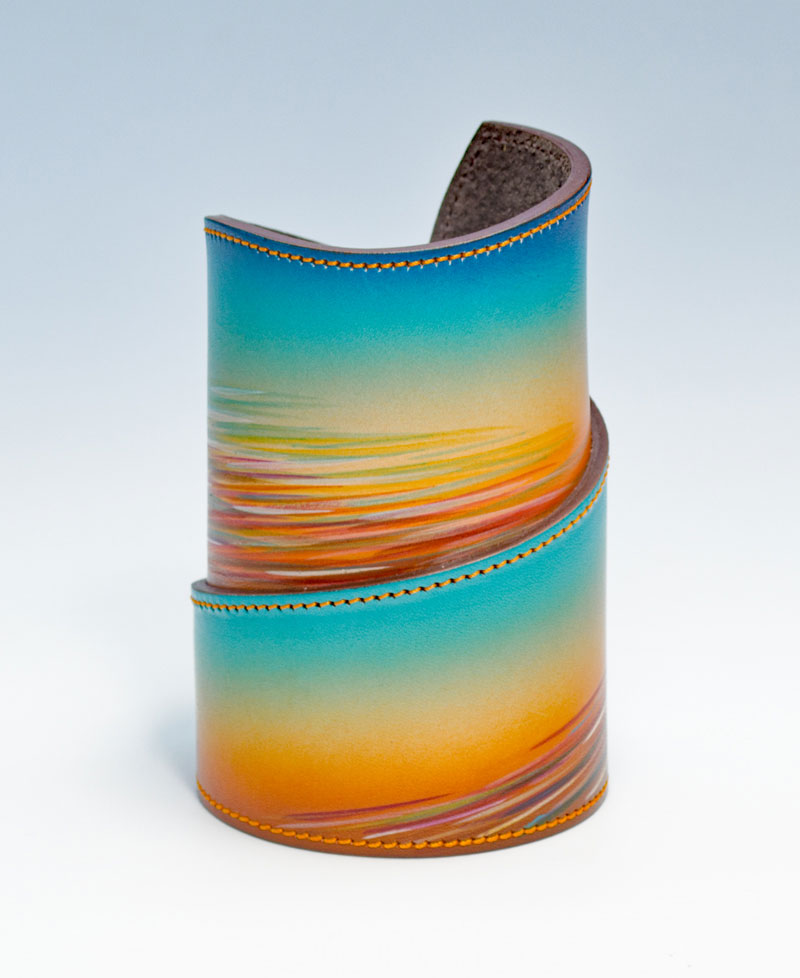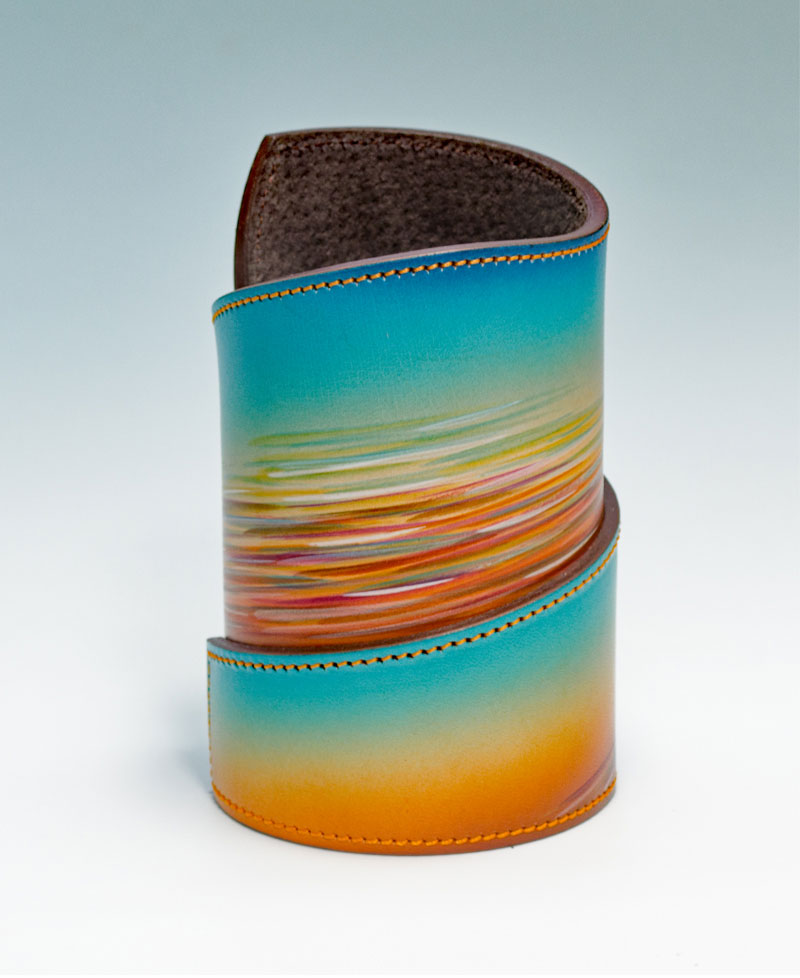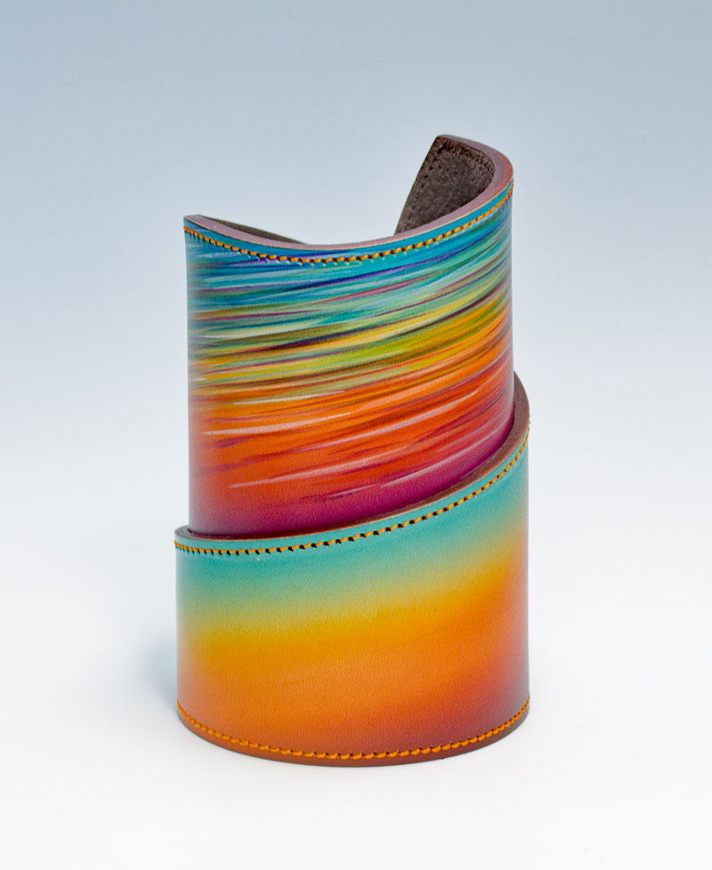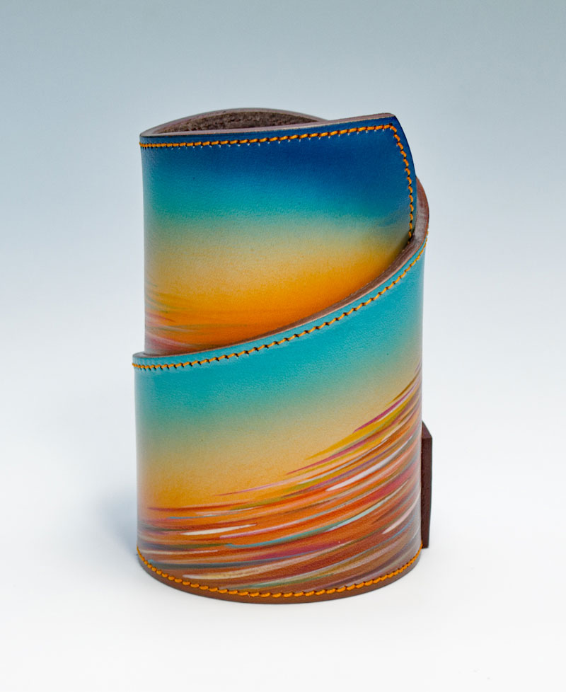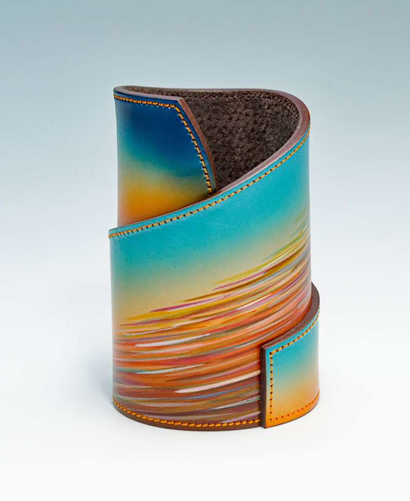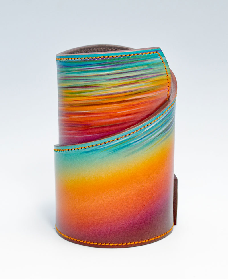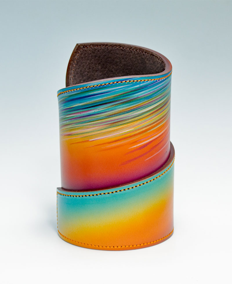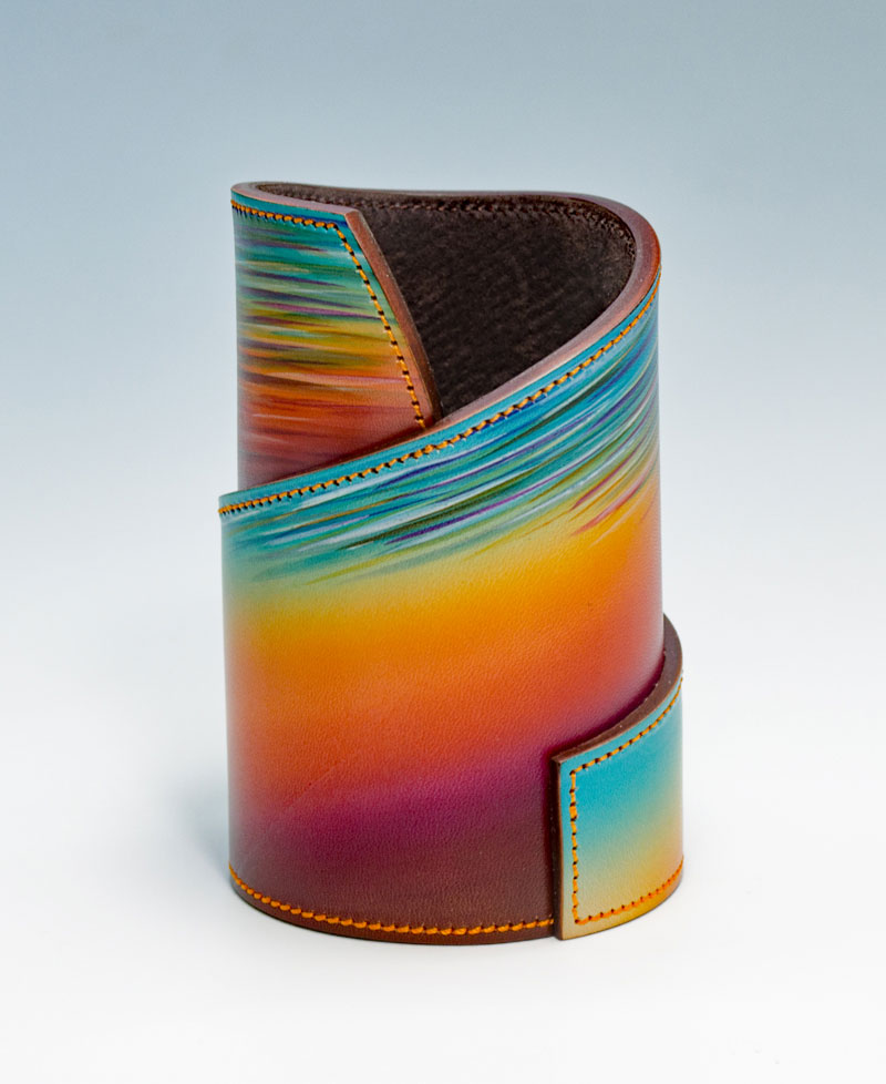 Elaborado en piel de vacuno con curtientes vegetales y policromado con tintes que respetan el medio ambiente. El interior está forrado con piel de pécari.